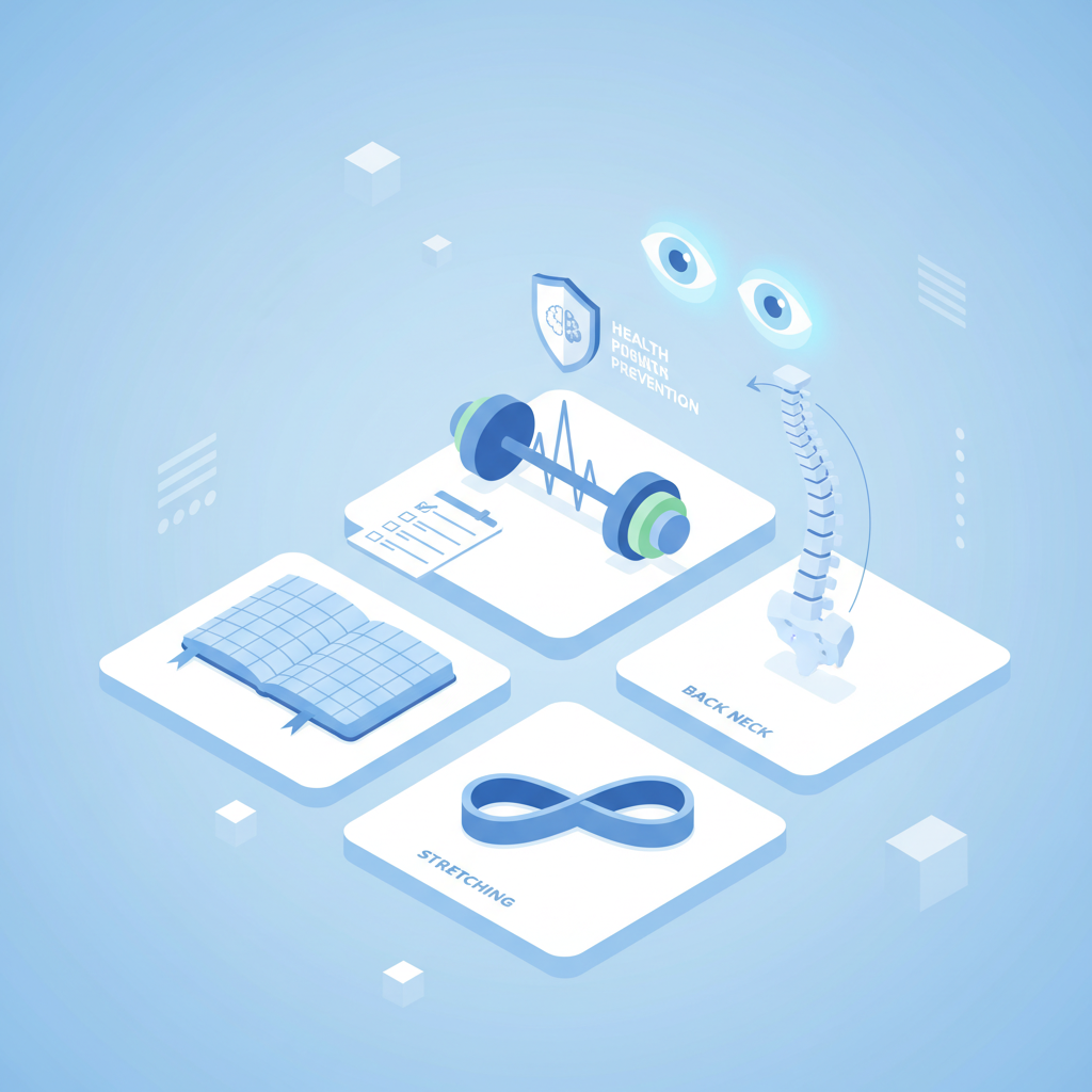 1. 스마트폰 사용 시간 제한: 하루 사용 시간을 정하고 알람을 설정하여 의식적으로 사용량을 조절합니다. 2. 규칙적인 휴식: 50분 작업 후 10분 휴식 등 집중 시간을 정하고 짧더라도 반드시 휴식을 취합니다. 3. 수분 섭취: 하루 8잔 이상의 물을 마셔 안구 건조를 예방하고 전반적인 신체 기능을 돕습니다. 4. 스트레칭 생활화: 업무 중 틈틈이 목, 어깨, 허리 스트레칭을 습관화합니다. 5. 바른 수면 자세: 너무 높거나 낮은 베개는 피하고, 옆으로 누울 때는 다리 사이에 베개를 끼우는 것이 좋습니다.